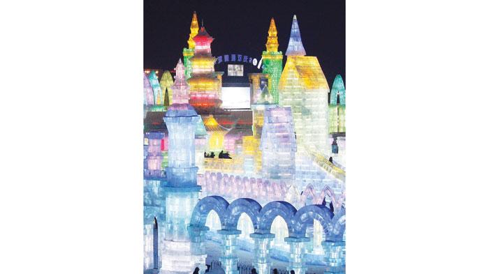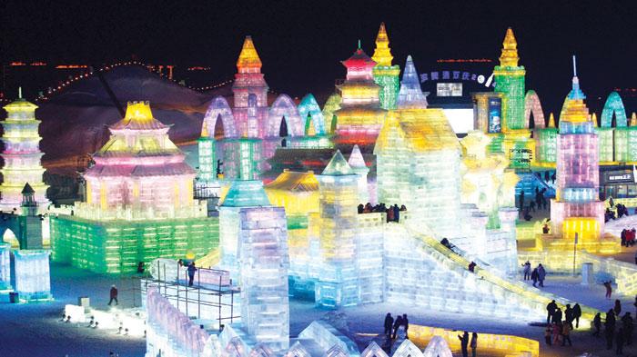 مدينة الثلج الصينية استقطبت اعدادا كبيرة من الزوار الذين تجولوا في ارجائها حيث تم انشاؤها من الثلج والجليد وبلغ حجمها من الثلج 150 ألف متر مكعب، بينما بلغ حجم الجليد 180 ألف متر مكعب على مساحة إجمالية 600 ألف متر (EPA)
