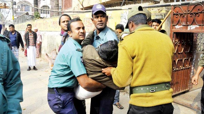رجال شرطة يحملون ناخباً بعد إصابته بانفجار بمركز للاقتراع في دكا أمس (أ ف ب)