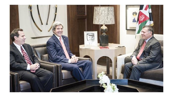 حديث باسم بين عاهل الأردن (يمين) ووزير الخارجية الأمريكي خلال لقائهما في عمّان أمس (أ ب)