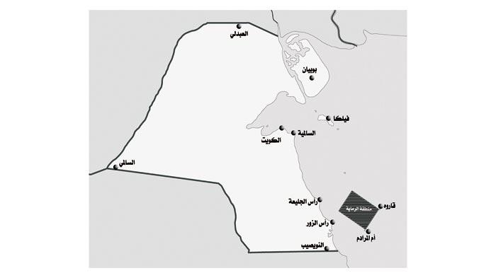 وقالت ان منطقة الرماية تقع على مسافة 16.5 ميلا بحريا شرق رأس الجليعة امتدادا لجزيرة قاروه وبمسافة 6 أميال بحرية شرق رأس الزور امتدادا الى جزيرة أم المرادم.