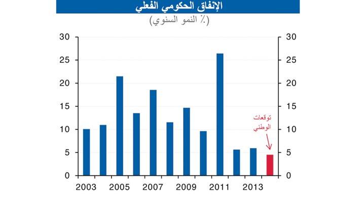 وعلى الرغم من تباطؤ النمو الذي تظهره بيانات الميزانية، الا أنه فعليا لن يكون بالحدة التي تشير اليها، وذلك لأن المصروفات الفعلية قد نمت بوتيرة معتدلة خلال العامين الماضيين، نتيجة تدابير الانفاق الاستثنائية وغير المتكررة التي اقرت في العام 2011.فقد سجل الانفاق الفعلي نمواً معتدلاً بواقع %6 في العامين 2012 و2013 مقارنة مع %26 في العام 2011.ونتوقع ان ينمو الانفاق الفعلي بمعدل أكثر اعتدالا هذا العام بواقع %5، أي تماشياً مع توقعات الحكومة، وبالتالي فان التباطؤ سيكون هامشياً.