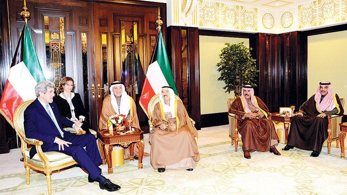 سمو الأمير مستقبلاً وزير الخارجية الأمريكي بحضور سمو ولي العهد والشيخ صباح الخالد