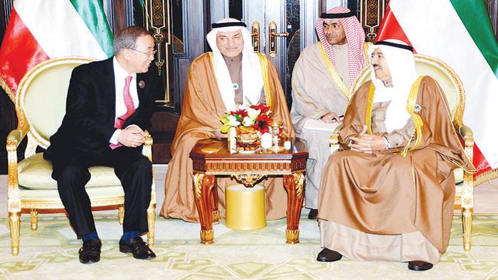 استقبل حضرة صاحب السمو أمير البلاد الشيخ صباح الأحمد الجابر الصباح بقاعة التحرير في قصر بيان صباح امس وبحضور سمو ولي العهد الشيخ نواف الأحمد الجابر الصباح الأمين العام للأمم المتحدة بان كي مون والوفد المرافق.