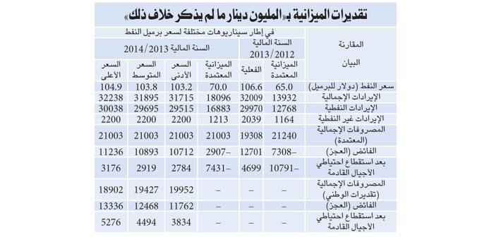 وتفيد السيناريوهات السابقة بتراوح أسعار النفط في نطاق ضيق ما بين 103 و105 دولارات للبرميل في السنة المالية الحالية. وعلى الرغم من أنها أقل من أسعار العام الماضي التي بلغت 107 دولارات، الا ان ذلك لايزال يشير الى سنة أخرى من الايرادات الحكومية القوية.وبالفعل، فان البيانات الرسمية تشير الى تحقيق ايرادات بمقدار 15.8 مليار دينار خلال النصف الأول من السنة المالية 2014/2013، أي أقل من توقعات الحكومة للسنة بأكملها بواقع ملياري دينار فقط.وبافتراض ان الانفاق الحكومي، كما هو متوقع، قد يأتي أقل بنسبة %5 الى %10 من تقديرات الحكومة، فقد تحقق الميزانية فائضاً يتراوح ما بين 11.8 و13.3 مليار دينار وذلك قبل استقطاع مخصصات صندوق احتياطي الأجيال القادمة، وسيعادل ذلك ما بين %23 الى %26 من الناتج المحلي الاجمالي المتوقع لعام 2013.