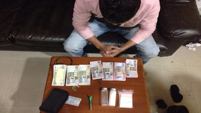 الشاب وأمامه المخدرات والفلوس