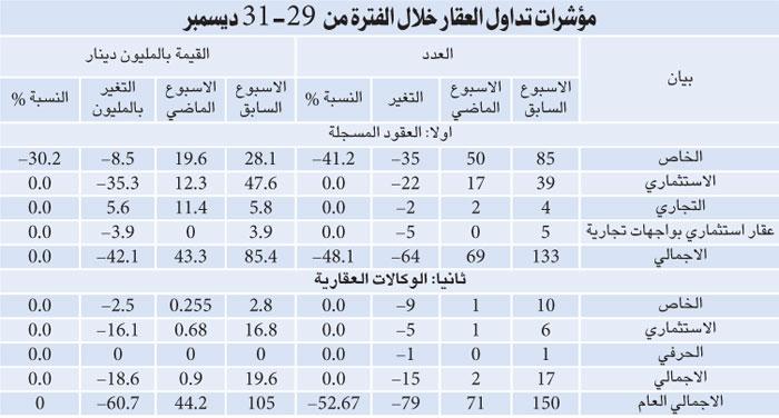 وأظهر مؤشر تداول العقود المسجلة انخفاضاً في اجمالي أعداد العقارات المتداولة خلال الفترة من 29 الى 31 ديسمبر بواقع 64 عقارا مقارنة بالفترة من 22 الى 26 ديسمبر، وذلك بعد ان انخفض اجمالي أعداد العقارات المتداولة من 133 الى 69 عقارا.