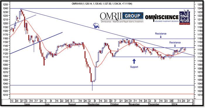 أقفل مؤشر أومنيشنز المشورة والراية بنهاية الاسبوع الاول للتداول من عام 2014 عند 1134.34 نقطة مرتفعا بمقدار 6.2 نقطة ومرتفعا عن اقفاله بنهاية الاسبوع الاسبق بمقدار العام السابق بنسبة %1.9، وكما توقعنا في تقريرنا السابق بتاريخ 12 يناير 2014.