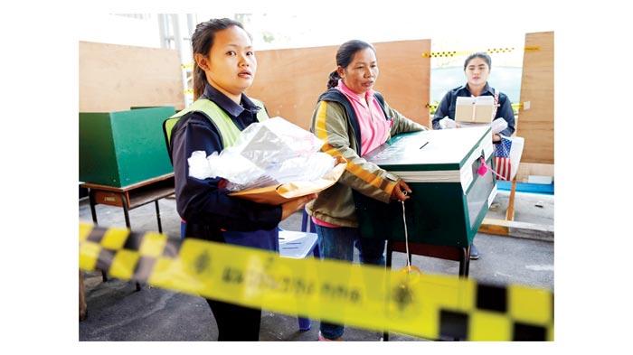 عاملات تايلانديات ينقلن أوراقاً وصندوق اقتراع من أحد المراكز الانتخابية بعد أن هاجمها مجموعة من المحتجين في بانكوك أمس (إ. بي. أ)