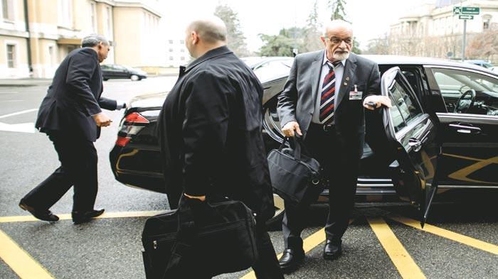 هيثم المالح عضو وفد المعارضة السورية الى «جنيف2» يصل الى مكان الاجتماع المباشر الثاني مع وفد الحكومة في جنيف أمس (أ ف ب)