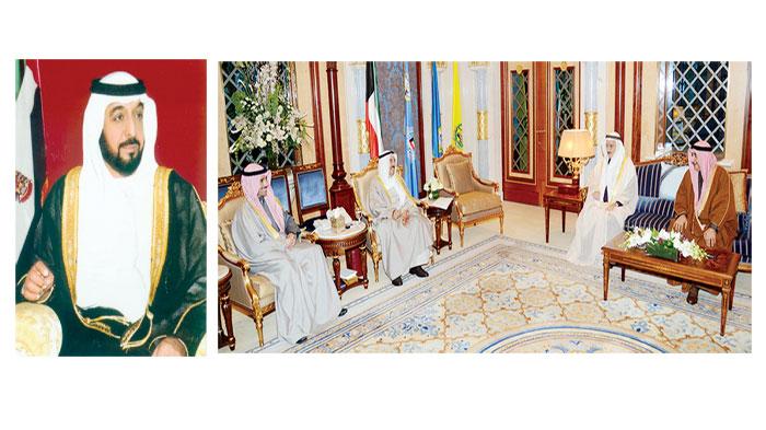 سمو الأمير مستقبلاً مرزوق الغانم والنائبين نبيل الفضل وعبدالحميد دشتي - رئيس الإمارات خليفة بن زايد