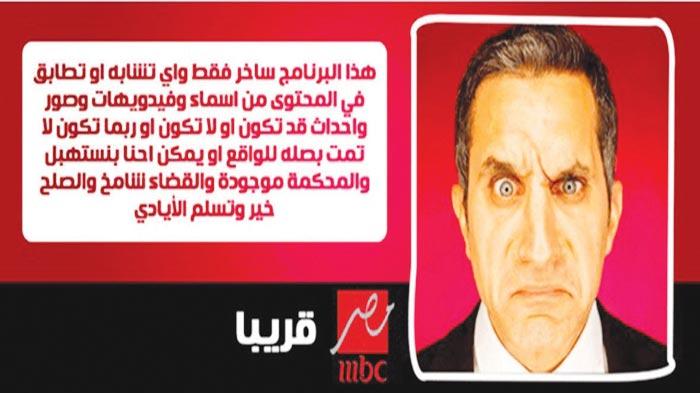أعلن الاعلامي الساخر باسم يوسف عودة برنامجه مرة أخرى مع نهاية فبراير القادم من خلال قناة «mbc». ونشر يوسف تحذيرا ساخرا قال فيه «هذا البرنامج ساخر فقط وأي تشابه أو تطابق في المحتوى من أسماء وفيديوهات وصور قد تكون أو ربما تكون لا تمت بصلة للواقع أو يمكن احنا بنستهبل والمحكمة موجودة والقضاء شامخ والصلح خير وتسلم الأيادي».