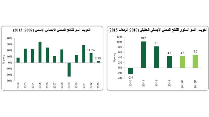 وتشير أحدث بيانات الحسابات القومية الى نمو الناتج المحلي الاجمالي الاسمي في الكويت بنسبة %2.3 في عام 2013 ليسجل 49.8 مليار دينار مقارنة بنمو بنسبة %14.6 في 2012 وفقا لأحدث البيانات الصادرة عن الادارة المركزية للاحصاء بالكويت.الا ان بيانات الناتج المحلي الاجمالي الحقيقي لا تزال غير متوفرة حتى الآن.
