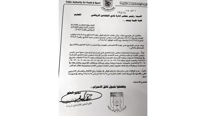 أرسلت الهيئة العامة للشباب والرياضة صباح امس كتابا رسميا مذيلا باسم نائب المدير العام لشؤون الرياضة احمد الخزعل موجها الى مجلس ادارة نادي التضامن يخطره بعدم صحة اجتماعات مجلس ادارة النادي التي تمت او تتم دون دعوة من رئيس مجلس الادارة او نائبه وبالتالي عدم الاعتداد بأي من قرارات مجلس ادارة النادي الصادرة في اجتماعاته السابقة وكذا القرارات الصادرة في اجتماعه رقم 30/ 2014 المنعقد بتاريخ السابع من سبتمبر وخاصة البنود ارقام (38 و39 و40 و41 و42و43 و44 و50 و52 و58 و69 و60 و61 و63 و64 و68 و71) والخاصة بتعيينات جديدة وزيادة رواتب وبدلات ومكافآت اللاعبين والمشاركة في معسكرات وبطولات واسقاط عضوية بعض اعضاء مجلس الادارة واعتبارها كأن لم تكن.