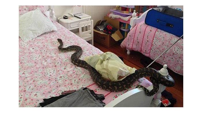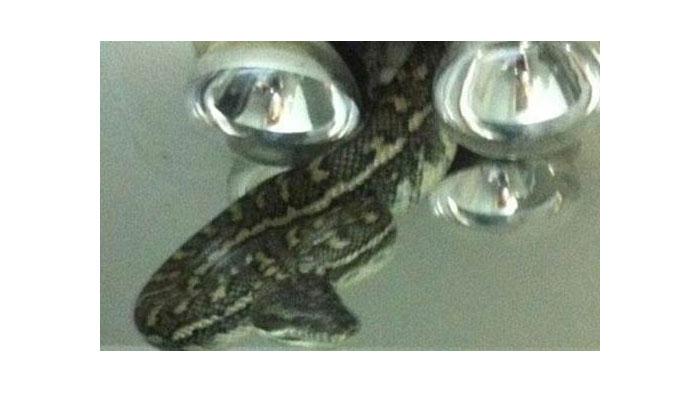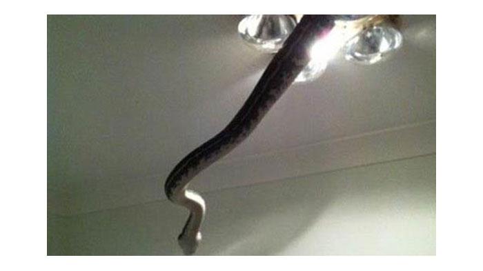 وذكر الموقع أن ثعباناً ضخماً من نوع «كاربت باثون» شوهد أثناء دخوله حمام منزل في مدينة بريزبن بأستراليا، عن طريق لمبة الإضاءة.