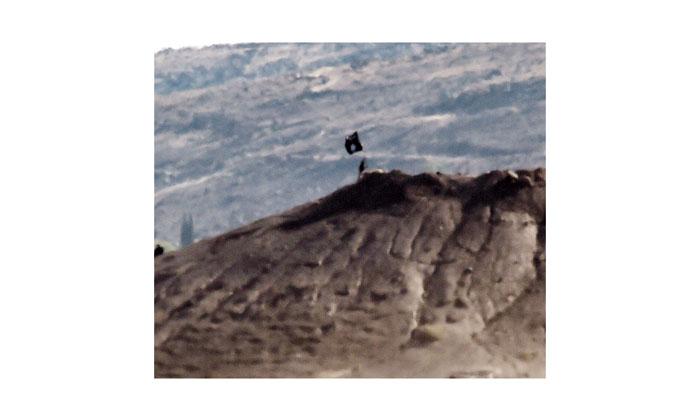 علم «داعش» مرفوعاً شرق كوباني (أ ف ب)