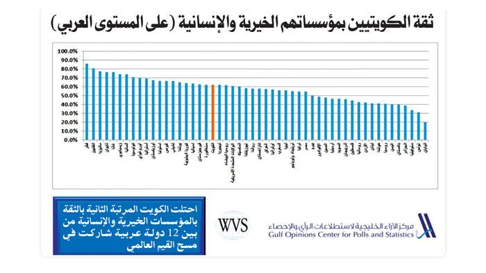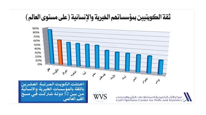 واحتلت الكويت ايضا المركز العشرين بالثقة بالمؤسسات الخيرية والانسانية من بين 52 دولة أيضاً.