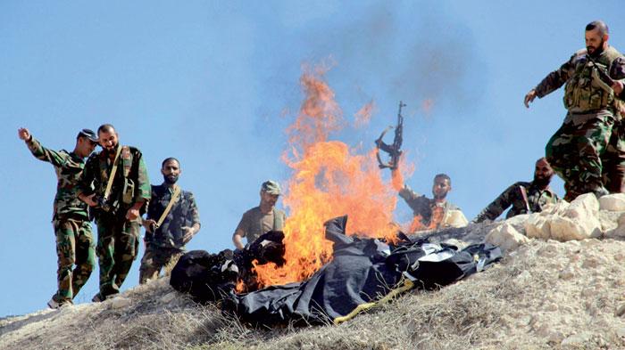 قوات النظام تحرق علم جبهة النصرة في قرية الزور بعد أن استعادت تلك القوات السيطرة على المنطقة والتلال المحيطة بها في ريف حماه (رويترز)