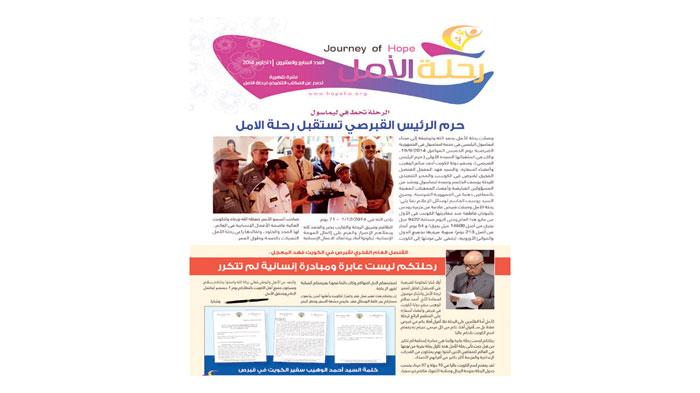 صدر عدد جديد من «نشرة الأمل» التي يصدرها «المكتب التنفيذي لرحلة الأمل».وتضمن العدد تقريراً عن وصول قارب الرحلة الى ميناء ليماسول الرئيسي في الجمهورية القبرصية حيث كانت في استقباله السيدة الأولى (حرم الرئيس القبرصي) وسفير دولة الكويت أحمد سالم الوهيب وأعضاء السفارة، والقنصل الفخري فهد المعجل والمدير التنفيذي للرحلة يوسف الجاسم وعمدة ليماسول وحشد من المسؤولين القبارصة وأعضاء الجمعيات المعنية بالمعاقين ذهنيا في قبرص.وقال يوسف الجاسم ان رحلة الأمل وصلت قبرص قادمة من جزيرة رودس باليونان قاطعة منذ مغادرتها الكويت في الأول من مايو الماضي مسافة 9422 ميلا بحريا من أصل 14600 ميل بحري في 54 يوما أبحار من أصل 213 يوما.كما تضمن العدد خبراً عن مأدبة عشاء اقامها السفير الكويتي في اسطنبول الشيخ فهد سالم الصباح مساء الأثنين 8 سبتمبر وحضرتها حرم الرئيس التركي السابق تورغت اوزال، وتقريراً عن زيارة فريق الرحلة يوم الثلاثاء 9 سبتمبر، مخيماً للمعاقين تابعا لبلدية اسطنبول، وتغطية لاستقبال سفير الكويت لدى ايطاليا الشيخ علي الخالد الصباح لوفد قارب (رحلة الأمل)، اضافة الى تقارير عن وصول قارب الرحلة الى موانئ اسطنبول وازمير وردوس ومغادرة القارب باليرمو في أيطاليا متوجها الى اليونان.