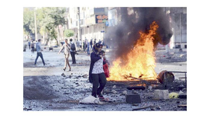 امرأة وطفلها يسيران وسط اشتباكات بين المحتجين الأكراد والشرطة التركية في ديار بكر (أ.ف.ب)