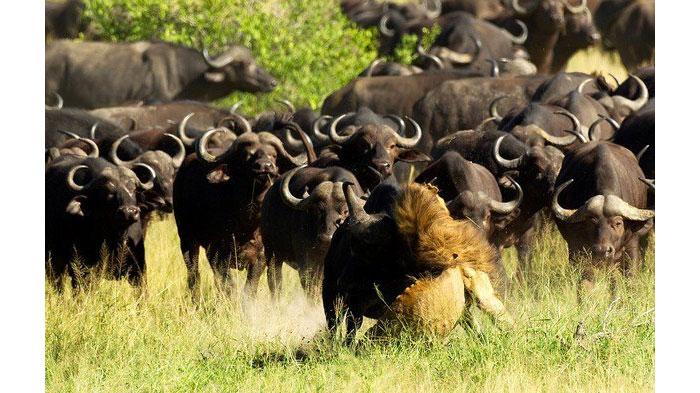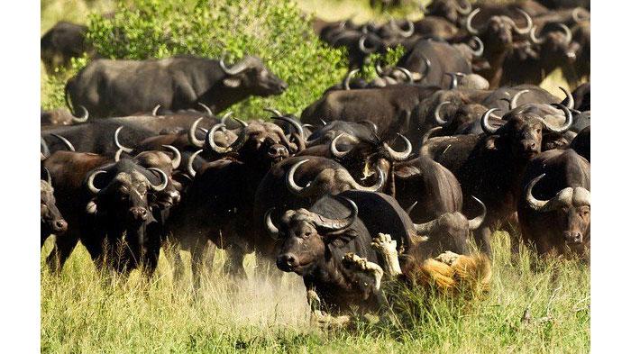 لقي أسد مصرعه دهساً تحت أقدام قطيع من الجاموس البري، حاصره في حديقة "كروجر" الوطنية بجنوب إفريقيا، ولم يترك القطيع ملك الغابة إلا جثة هامدة مهشمة الرأس.