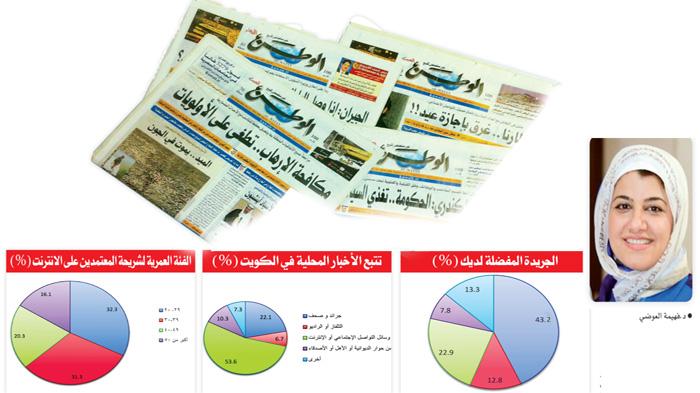 صحيفة «الوطن» الأكثر انتشارا في الكويت، و%43.2 من أفراد المجتمع يفضلونها على غيرها من الصحف المحلية.هذا ما أكدته دراسة احصائية حديثة للأستاذة المشاركة بقسم الاحصاء وبحوث العمليات في كلية العلوم بجامعة الكويت د.فهيمة العوضي.وجاء في الدراسة ان %60 من قراء «الوطن» هن من النساء، وأن %56 من قرائها يهتمون بالأخبار السياسية، و14% بالأخبار الرياضية، و%26 بالأخبار الثقافية، و%11 بالأخبار الفنية.