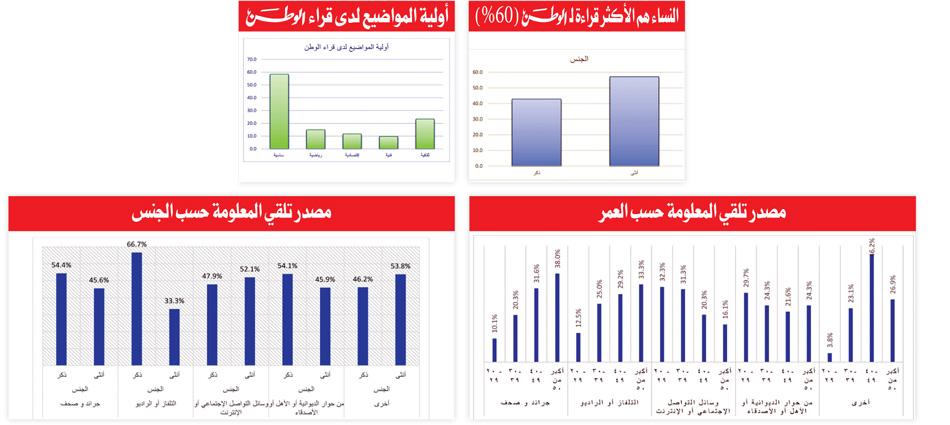واوضحت ان الدائرة الخامسة تشهد الانتشار الاوسع لـ«الوطن» تليها الدائرة الثانية فالثالثة فالأولى واخيرا الرابعة. وأوضحت الدراسة ان %56 من قراء «الوطن» يهتمون بالاخبار السياسية و%14 يهتمون بالأخبار الرياضية و%26 بالأخبار الثقافية و%11 بالأخبار الفنية.