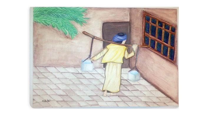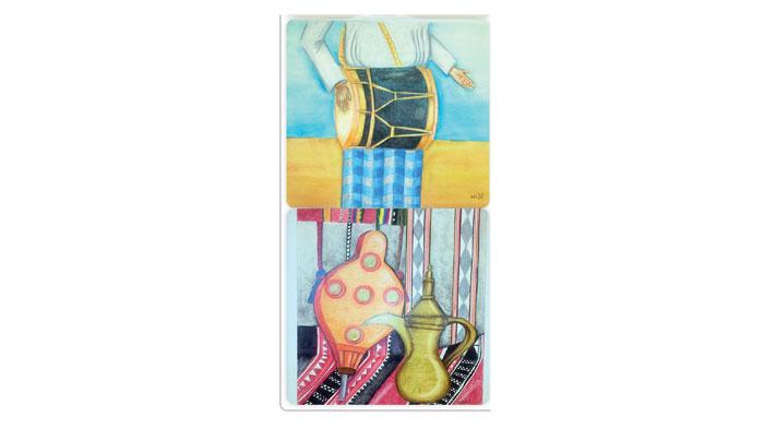 وكذلك عن علم الكويت القديم أو من خلال تصويرها لبعض المهن المميزة في الماضي مثل الصيد وسقي الماء من خلال لوحة «الكندري»، وأيضا صناعة السدو وصور الدلة واستكانة الشاي، ولوحة «التنور» و«منفاخ الفحم».