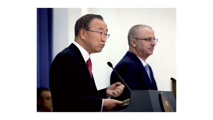 وأكد كي مون خلال مؤتمر صحافي مع رئيس الوزراء الفلسطيني رامي الحمد الله في رام الله، على أهمية تثبيت وقف اطلاق النار بين الفصائل الفلسطينية وإسرائيل والتفاهم فيما بينهما لجعله اتفاقاً مستداماً.
