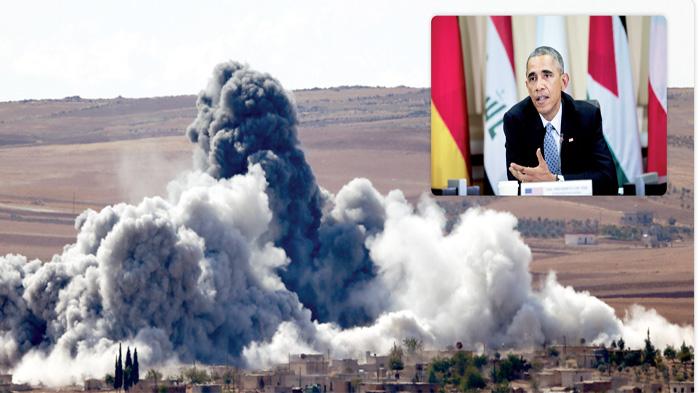 دخان كثيف يتصاعد بعد ضربة جوية عنيفة على قرية بجوار كوباني. وفي الإطار باراك أوباما الرئيس الأمريكي يتحدث خلال اجتماع في قاعدة جوية عسكرية في ميريلاند