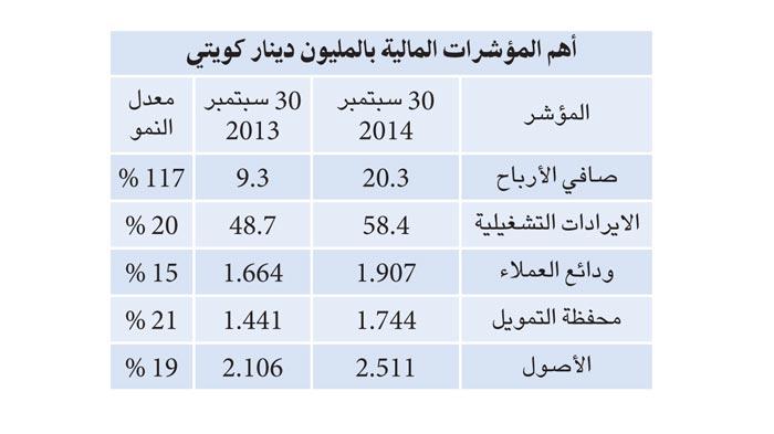 أعلن بنك بوبيان عن تحقيق صافي ربح بنهاية سبتمبر 2014 بلغ 20.3 مليون دينار بزيادة %117 عن نفس الفترة من العام الماضي وبربحية سهم بلغت 10.3 فلوس مقارنة مع 4.75 فلوس.