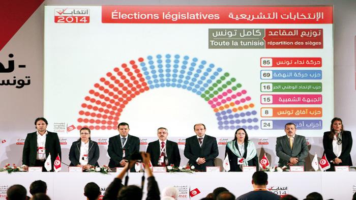 أعضاء الهيئة العليا المستقلة للانتخابات خلال إعلان النتائج الرسمية للانتخابات التشريعية في تونس (إ. بي. أ)