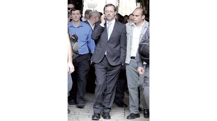 موشيه فيغلن نائب رئيس الكنيست الإسرائيلي (وسط) محاطا بحراسة لدى توجهه لاقتحام الأقصى أمس (أ ف ب)