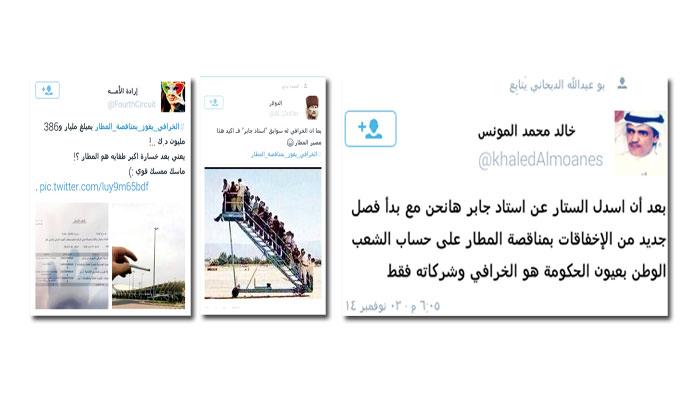 أطلق مغردون في موقع التواصل الاجتماعي تويتر هاشتاق #الخرافي_يفوز_بمناقصة_المطار، معبرين بذلك عن سخطهم وتهكمهم ورفضهم على ارساء مناقصة المطار على شركة الخرافي.