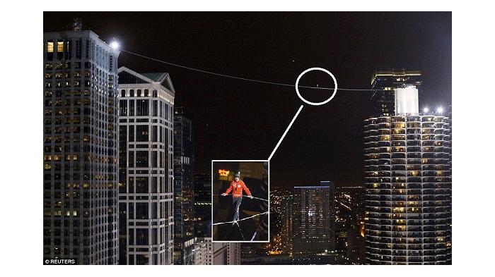وحسب صحيفة "الديلي ميل" البريطانية، سار المغامر الأمريكي نك وولندا، 36 عاماً، فجر يوم 2 نوفمبر الجاري، على حبل مشدود من برج "ويست مارينا سيتي" إلى مبنى "ليون بارنيت" وهو مفتوح العينين، وقطع المسافة بينهما فوق نهر شيكاغو في ست دقائق و52 ثانية، ثم وضع عصابة سوداء على عينيه وسار على حبل آخر إلى برج "ايست مارينا سيتي" وذلك في دقيقة و 17 ثانية.