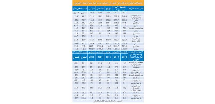 وفيما يخص بنك الائتمان الكويتي، فقد استعادت القروض الاسكانية المقررة قوتها بعد ان شهدت تراجعاً حاداً في الشهرين الماضيين.فقد أقرّ البنك 484 قرضا بقيمة 29.3 مليون دينار تقريباً خلال شهر سبتمبر.وقد تراجع عدد القروض المقررة بواقع 22 على أساس سنوي نتيجة بعض العوامل القاعدية، فقد شهد العام 2013 ارتفاعاً في عدد القروض المقررة.بينما بلغت قيمة القروض المنصرفة 18 مليون دينار، مسجلة ارتفاعا بواقع 11.5 على أساس سنوي.