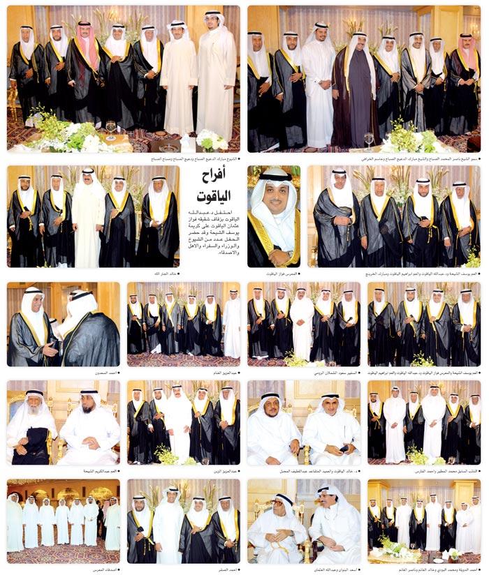 احتفل د.عبدالله الياقوت بزفاف شقيقه فواز عثمان الياقوت على كريمة يوسف الشيحة وقد حضر الحفل عدد من الشيوخ والوزراء والسفراء والاهل والاصدقاء.