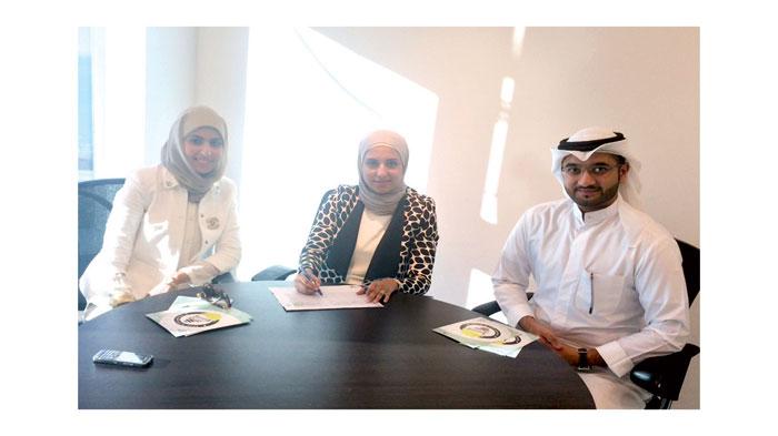 زينب القراشي تتوسط علي الشطي وفرح فاضل من اللجنة المنظمة للمعسكر