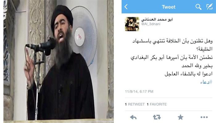 وكتب العدناني متسائلاً: هل تظنون بأن الخلافة تنتهى باستشهاد الخليفة؟ نطمئن الأمة بأن أميرها أبو بكر البغدادى بخير ولله الحمد، أدعو له بالشفاء العاجل".