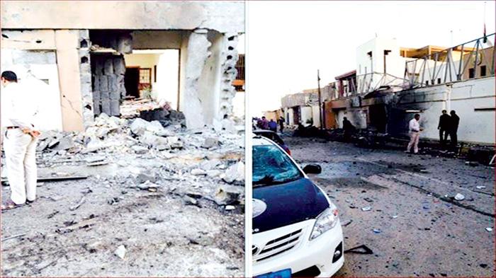 صورتان تظهران جانباً من التفجير بجوار السفارة الإماراتية والسفارة المصرية في طرابلس أمس (كونا)