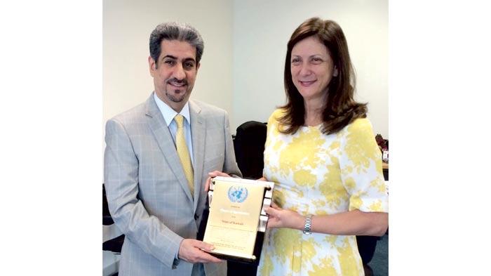 السفير وليد الكندري لدى تسلمه الدرع التكريمية للكويت من منسقة الأمم المتحدة لوسيا كارفالهو