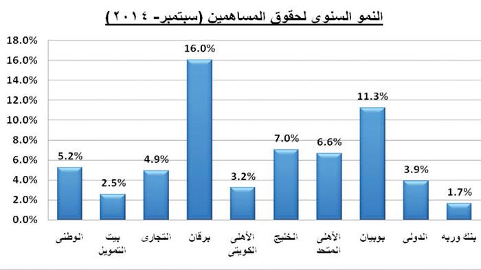 احتل بنك برقان المرتبة الأولى في نمو حقوق المساهمين والتي سجلت 552.7 مليون دينار بالمقارنة مع 476.3 مليوناً بنهاية سبتمبر 2013 الماضي وبنسبة نمو بلغت %16.0 كما احتل بنك بوبيان المرتبة الثانية بنسبة ارتفاع في حقوق المساهمين بلغت %11.3 مسجلة 287 مليون دينار نهاية سبتمبر 2014.