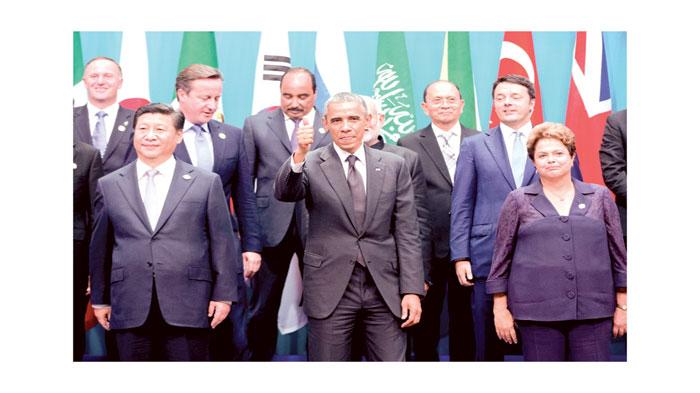 الرئيس الأمريكي أوباما يتوسط نظيرته البرازيلية ورئيس الوزراء البريطاني خلال قمة دول العشرين في بريزبين أمس (رويترز)