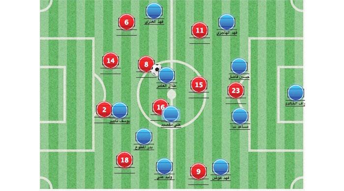 اما على صعيد الظهيرين فهد عوض وفهد الهاجري فإنهما لا يلامان على عدم اداء ادوارهما الهجومية كون الخلل كان في فكرة المدرب بالارتداد الهجومي معتمدا على السرعات حيث تكون فرصة تقدم الظهيرين معدومة تماما.. ولكنهما بشكل عام أجادا بالشق الدفاعي وخصوصا فهد الهاجري.