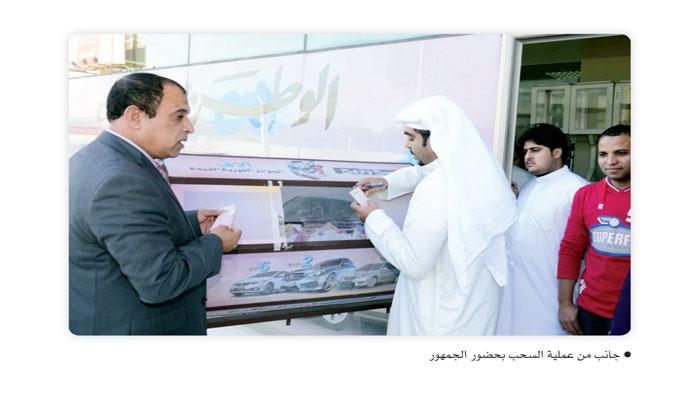 وتوجهت أنظار المشاركين لعجلة الحظ، في حالة ترقب وانتظار ودقات قلب تخفق من القلق، لمعرفة سعداء الحظ الفائزين بجوائز «الوطن» القيمة، ثم تأتي لحظة الاعلان عن الفائزين عندما يسحب ممثل التجارة والصناعة أحمد الحمد، الكوبون الفائز من صندوق السحب وسط توتر وهدوء يخيم على وجوه الحاضرين، ويتم سحب «الكوبون» في مشهد أكثر توهجا، ليعلن بعدها مندوب وزارة التجارة عن اسم صاحب الكوبون الفائز ورقمه المسلسل، والجائزة التي حصل عليها وهي سيارة قيمة، وتكرر هذا المشهد 7 مرات متتالية وسط ترقب وأنظار شاخصة تجاه الصندوق.