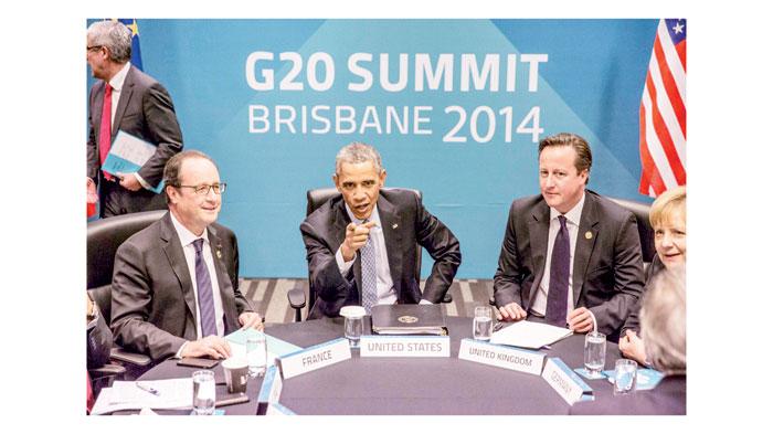 أوباما الرئيس الأمريكي يتوسط نظيره الفرنسي أولاند (يسار) ورئيس الوزراء البريطاني كاميرون والمستشارة الألمانية ميركل خلال اجتماع قمة العشرين في بريزبين
