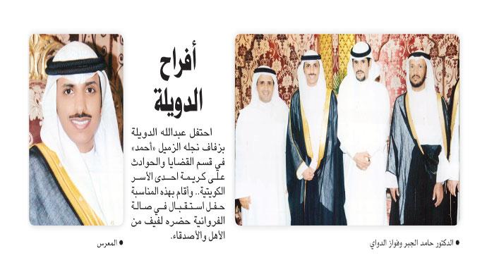 احتفل عبدالله الدويلة بزفاف نجله الزميل «أحمد» في قسم القضايا والحوادث على كريمة احدى الأسر الكويتية.. وأقام بهذه المناسبة حفل استقبال في صالة الفروانية حضره لفيف من الأهل والأصدقاء.