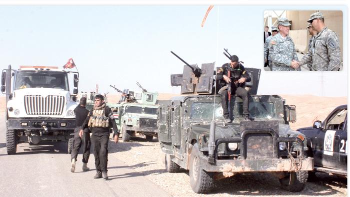 عناصر من القوات العراقية تتخذ تحصيناتها خلال مواجهات مع مسلحي «داعش». وفي الإطار الجنرال مارتن ديمبسي (يسار) يصافح أحد الجنود الأمريكيين في العراق (رو