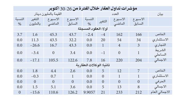 فقد أظهرت المؤشرات العقارية الصادرة عن ادارة التسجيل العقاري والتوثيق بوزارة العدل ارتفاعاً في أعداد العقارات المتداولة خلال الفترة من 26 الى 30 أكتوبر بواقع 21 عقاراً، حيث ارتفع المؤشر الاجمالي من 212 الى 233 عقاراً، لكن القيمة الاجمالية للعقارات المتداولة خلال تلك الفترة انخفضت من 126.2 الى 110.6 ملايين دينار أي بواقع 15.6 مليون دينار.