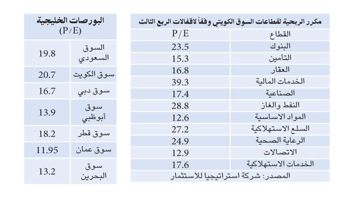 وبالنظر لمكرر الربحية على مستوى أسواق المال الخليجية فاننا نجد ان بورصة الكويت هي أعلى مكرر ربحية بواقع 20.7 مرة وفقا لاقفالات الربع الثالث من العام الجاري وهو ما يعني ان البورصة الكويتية على الرغم من حالة الضعف التي تنتابها منذ فترة مازالت الأعلى سعراً بين بورصات الخليج.