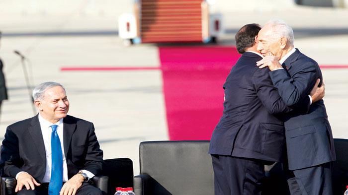 الرئيسان الفرنسي فرانسوا أولاند والإسرائيلي شيمون بيريز يتعانقان فيما يبتسم نتنياهو في مطار بن غوريون أمس